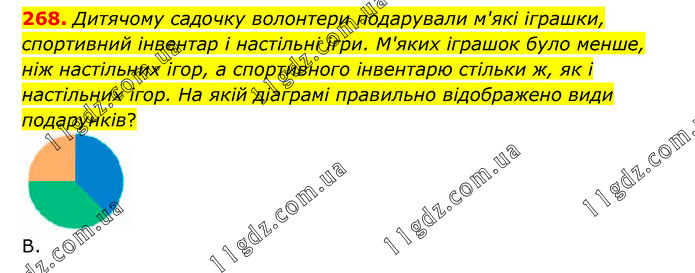 Дитячому садочку волонтери подарували м'які іграшки, спортивний інвентар і настільні ігри. М'яких іграшок було менше, ніж настільних ігор, а спортивного інвентарю стільки ж, як і настільних ігор. На якій діаграмі правильно відображено види подарунків? В.