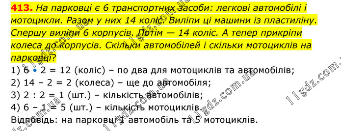 На парковці є 6 транспортних засоби: легкові автомобілі і мотоцикли. Разом у них 14 коліс. Виліпи ці машини із пластиліну. Спершу виліпи 6 корпусів. Потім — 14 коліс. А тепер прикріпи колеса до корпусів. Скільки автомобілей і скільки мотоциклів на парковці? 1) 6 • 2 = 12 (коліс) – по два для мотоциклів та автомобілів; 2) 14 – 2 = 2 (колеса) – ще до автомобіля; 3) 2 : 2 = 1 (шт.) – кількість автомобілів; 4) 6 – 1 = 5 (шт.) – кількість мотоциклів. Відповідь: на парковці 1 автомобіль та 5 мотоциклів.