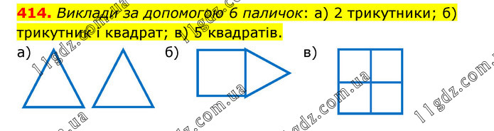 Виклади за допомогою 6 паличок: а) 2 трикутники; б) трикутник і квадрат; в) 5 квадратів.