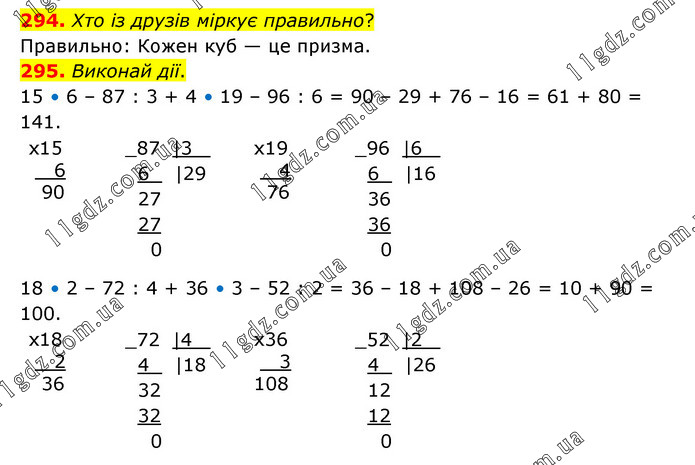 294. Хто із друзів міркує правильно? Правильно: Кожен куб — це призма. 295. Виконай дії. 15 • 6 – 87 : 3 + 4 • 19 – 96 : 6 = 90 – 29 + 76 – 16 = 61 + 80 = 141. 18 • 2 – 72 : 4 + 36 • 3 – 52 : 2 = 36 – 18 + 108 – 26 = 10 + 90 = 100.