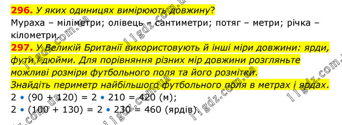 296. У яких одиницях вимірюють довжину? Мураха – міліметри; олівець – сантиметри; потяг – метри; річка – кілометри. 297. У Великій Британії використовують й інші міри довжини: ярди, фути і дюйми. Для порівняння різних мір довжини розгляньте можливі розміри футбольного поля та його розмітки. Знайдіть периметр найбільшого футбольного поля в метрах і ярдах. 2 • (90 + 120) = 2 • 210 = 420 (м); 2 • (100 + 130) = 2 • 230 = 460 (ярдів).