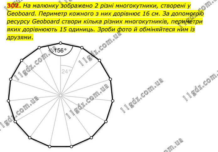 На малюнку зображено 2 різні многокутники, створені у Geoboard. Периметр кожного з них дорівнює 16 см. За допомогою ресурсу Geoboard створи кілька різних многокутників, периметри яких дорівнюють 15 одиниць. Зроби фото й обміняйтеся ним із друзями.