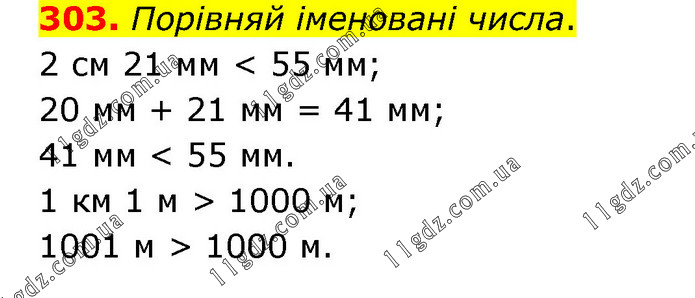 Порівняй іменовані числа. 2 см 21 мм < 55 мм; 20 мм + 21 мм = 41 мм; 41 мм < 55 мм. 1 км 1 м > 1000 м; 1001 м > 1000 м.