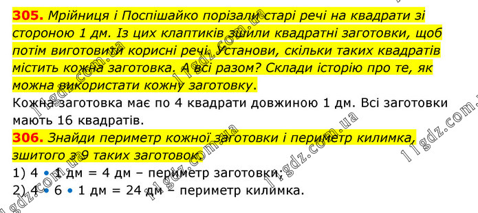 305. Мрійниця і Поспішайко порізали старі речі на квадрати зі стороною 1 дм. Із цих клаптиків зшили квадратні заготовки, щоб потім виготовити корисні речі. Установи, скільки таких квадратів містить кожна заготовка. А всі разом? Склади історію про те, як можна використати кожну заготовку. Кожна заготовка має по 4 квадрати довжиною 1 дм. Всі заготовки мають 16 квадратів. 306. Знайди периметр кожної заготовки і периметр килимка, зшитого з 9 таких заготовок. 1) 4 • 1 дм = 4 дм – периметр заготовки; 2) 4 • 6 • 1 дм = 24 дм – периметр килимка.