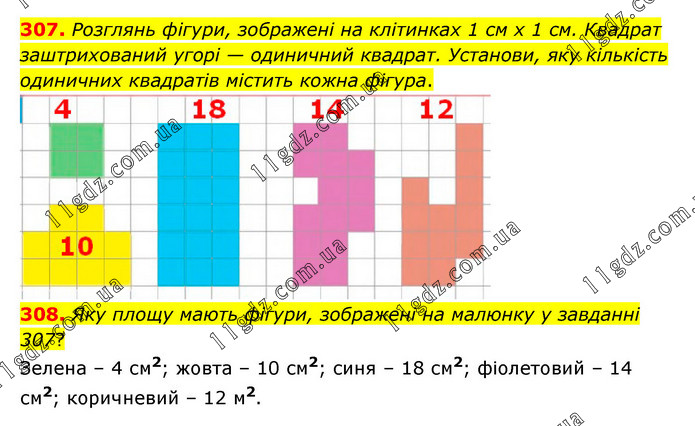 307. Розглянь фігури, зображені на клітинках 1 см х 1 см. Квадрат заштрихований угорі — одиничний квадрат. Установи, яку кількість одиничних квадратів містить кожна фігура. 308. Яку площу мають фігури, зображені на малюнку у завданні 307? Зелена – 4 см2; жовта – 10 см2; синя – 18 см2; фіолетовий – 14 см2; коричневий – 12 м2.