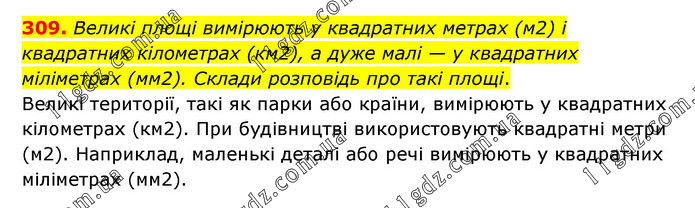 Великі площі вимірюють у квадратних метрах (м2) і квадратних кілометрах (км2), а дуже малі — у квадратних міліметрах (мм2). Склади розповідь про такі площі. Великі території, такі як парки або країни, вимірюють у квадратних кілометрах (км2). При будівництві використовують квадратні метри (м2). Наприклад, маленькі деталі або речі вимірюють у квадратних міліметрах (мм2).