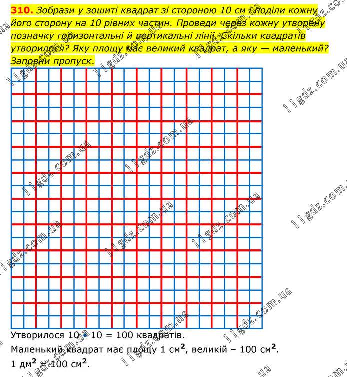Зобрази у зошиті квадрат зі стороною 10 см і поділи кожну його сторону на 10 рівних частин. Проведи через кожну утворену позначку горизонтальні й вертикальні лінії. Скільки квадратів утворилося? Яку площу має великий квадрат, а яку — маленький? Заповни пропуск. Утворилося 10 • 10 = 100 квадратів. Маленький квадрат має площу 1 см2, великій – 100 см2. 1 дм2 = 100 см2.