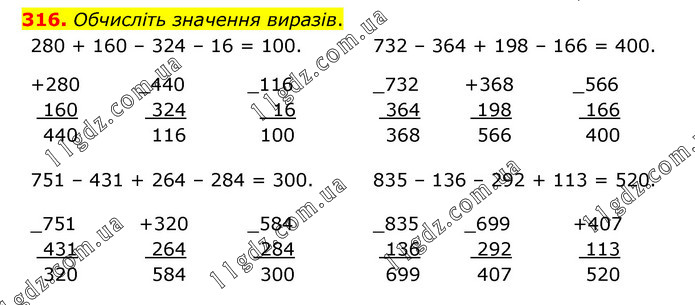 Обчисліть значення виразів. 280 + 160 – 324 – 16 = 100. 732 – 364 + 198 – 166 = 400. 751 – 431 + 264 – 284 = 300. 835 – 136 – 292 + 113 = 520.