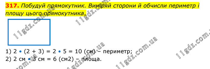 Побудуй прямокутник. Виміряй сторони й обчисли периметр і площу цього прямокутника. 1) 2 • (2 + 3) = 2 • 5 = 10 (см) – периметр; 2) 2 см • 3 см = 6 (см2) – площа.