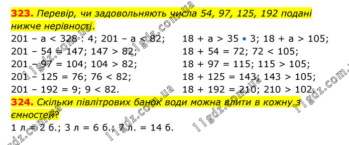 323. Перевір, чи задовольняють числа 54, 97, 125, 192 подані нижче нерівності. 201 – а < 328 : 4; 201 – а < 82; 201 – 54 = 147; 147 > 82; 201 – 97 = 104; 104 > 82; 201 – 125 = 76; 76 < 82; 201 – 192 = 9; 9 < 82. 18 + а > 35 • 3; 18 + a > 105; 18 + 54 = 72; 72 < 105; 18 + 97 = 115; 115 > 105; 18 + 125 = 143; 143 > 105; 18 + 192 = 210; 210 > 102. 324. Скільки півлітрових банок води можна влити в кожну з ємностей? 1 л = 2 б.; 3 л = 6 б.; 7 л. = 14 б.