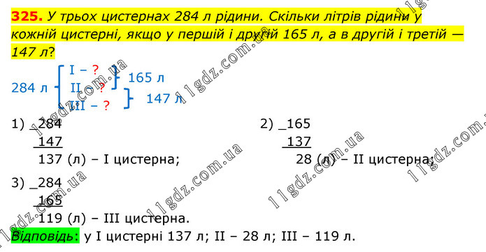 У трьох цистернах 284 л рідини. Скільки літрів рідини у кожній цистерні, якщо у першій і другій 165 л, а в другій і третій — 147 л? Відповідь: у І цистерні 137 л; ІІ – 28 л; ІІІ – 119 л.