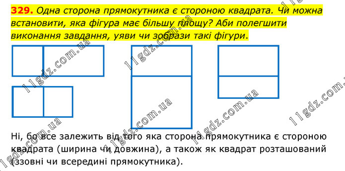 Одна сторона прямокутника є стороною квадрата. Чи можна встановити, яка фігура має більшу площу? Аби полегшити виконання завдання, уяви чи зобрази такі фігури. Ні, бо все залежить від того яка сторона прямокутника є стороною квадрата (ширина чи довжина), а також як квадрат розташований (ззовні чи всередині прямокутника).