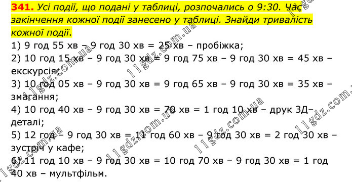 Усі події, що подані у таблиці, розпочались о 9:30. Час закінчення кожної події занесено у таблиці. Знайди тривалість кожної події. 1) 9 год 55 хв – 9 год 30 хв = 25 хв – пробіжка; 2) 10 год 15 хв – 9 год 30 хв = 9 год 75 хв – 9 год 30 хв = 45 хв – екскурсія; 3) 10 год 05 хв – 9 год 30 хв = 9 год 65 хв – 9 год 30 хв = 35 хв – змагання; 4) 10 год 40 хв – 9 год 30 хв = 70 хв = 1 год 10 хв – друк 3Д–деталі; 5) 12 год – 9 год 30 хв = 11 год 60 хв – 9 год 30 хв = 2 год 30 хв – зустріч у кафе; 6) 11 год 10 хв – 9 год 30 хв = 10 год 70 хв – 9 год 30 хв = 1 год 40 хв – мультфільм.