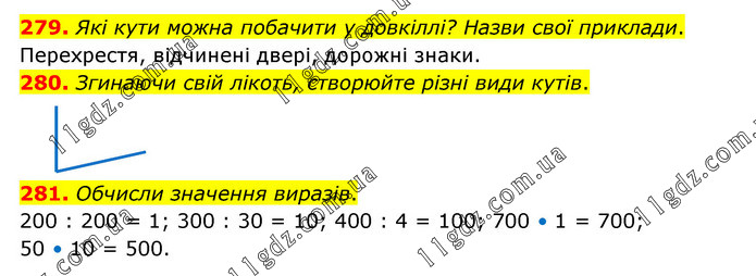 279. Які кути можна побачити у довкіллі? Назви свої приклади. Перехрестя, відчинені двері, дорожні знаки. 280. Згинаючи свій лікоть, створюйте різні види кутів. 281. Обчисли значення виразів. 200 : 200 = 1; 300 : 30 = 10; 400 : 4 = 100; 700 • 1 = 700; 50 • 10 = 500.