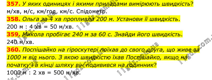 357. У яких одиницях і якими приладами вимірюють швидкість? м/хв, м/с, км/год, км/с. Спідометр. 358. Ольга за 4 хв пропливла 200 м. Установи її швидкість. 200 м : 4 хв = 50 м/хв. 359. Микола пробігає 240 м за 60 с. Знайди його швидкість. 240 м/хв. 360. Поспішайко на гіроскутері поїхав до свого друга, що живе за 1000 м від нього. З якою швидкістю їхав Поспішайко, якщо на початку і в кінці шляху він подивився на годинник? 1000 м : 2 хв = 500 м/хв.
