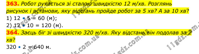363. Робот рухається зі сталою швидкістю 12 м/хв. Розглянь рисунок і встанови, яку відстань пройде робот за 5 хв? А за 10 хв? 1) 12 • 5 = 60 (м); 2) 12 • 10 = 120 (м). 364. Заєць біг зі швидкістю 320 м/хв. Яку відстань він подолав за 2 хв? 320 • 2 = 640 м.