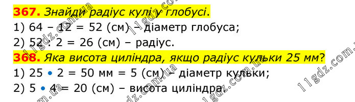 367. Знайди радіус кулі у глобусі. 1) 64 – 12 = 52 (см) – діаметр глобуса; 2) 52 : 2 = 26 (см) – радіус. 368. Яка висота циліндра, якщо радіус кульки 25 мм? 1) 25 • 2 = 50 мм = 5 (см) – діаметр кульки; 2) 5 • 4 = 20 (см) – висота циліндра.
