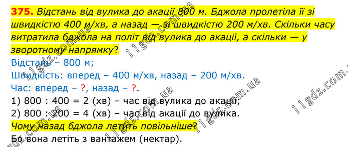Відстань від вулика до акації 800 м. Бджола пролетіла її зі швидкістю 400 м/хв, а назад — зі швидкістю 200 м/хв. Скільки часу витратила бджола на політ від вулика до акації, а скільки — у зворотному напрямку? Відстань – 800 м; Швидкість: вперед – 400 м/хв, назад – 200 м/хв. Час: вперед – ?, назад – ?. 1) 800 : 400 = 2 (хв) – час від вулика до акації; 2) 800 : 200 = 4 (хв) – час від акації до вулика. Чому назад бджола летить повільніше? Бо вона летіть з вантажем (нектар).