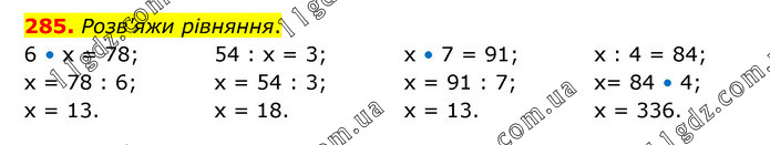 Розв'яжи рівняння. 6 • х = 78; х = 78 : 6; х = 13. 54 : х = 3; х = 54 : 3; х = 18. х • 7 = 91; х = 91 : 7; х = 13. х : 4 = 84; х= 84 • 4; х = 336.