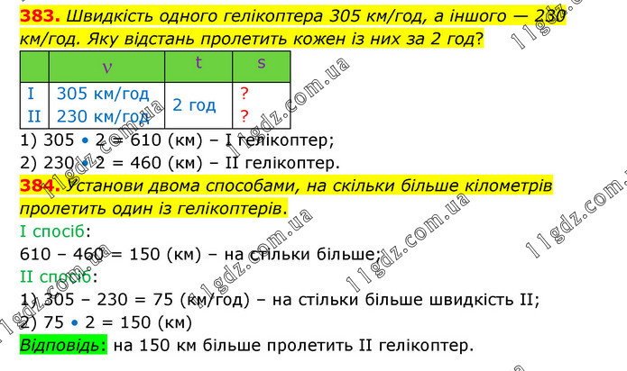 383. Швидкість одного гелікоптера 305 км/год, а іншого — 230 км/год. Яку відстань пролетить кожен із них за 2 год? 1) 305 • 2 = 610 (км) – І гелікоптер; 2) 230 • 2 = 460 (км) – ІІ гелікоптер. 384. Установи двома способами, на скільки більше кілометрів пролетить один із гелікоптерів. І спосіб: 610 – 460 = 150 (км) – на стільки більше; ІІ спосіб: 1) 305 – 230 = 75 (км/год) – на стільки більше швидкість ІІ; 2) 75 • 2 = 150 (км) Відповідь: на 150 км більше пролетить ІІ гелікоптер.