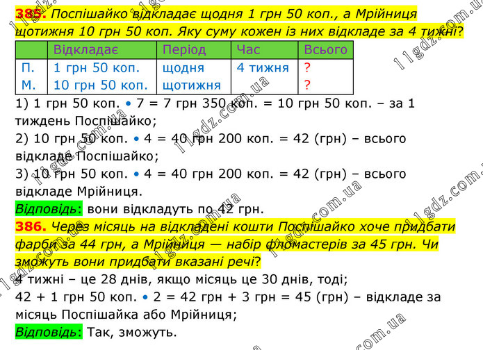 385. Поспішайко відкладає щодня 1 грн 50 коп., а Мрійниця щотижня 10 грн 50 коп. Яку суму кожен із них відкладе за 4 тижні? 1) 1 грн 50 коп. • 7 = 7 грн 350 коп. = 10 грн 50 коп. – за 1 тиждень Поспішайко; 2) 10 грн 50 коп. • 4 = 40 грн 200 коп. = 42 (грн) – всього відкладе Поспішайко; 3) 10 грн 50 коп. • 4 = 40 грн 200 коп. = 42 (грн) – всього відкладе Мрійниця. Відповідь: вони відкладуть по 42 грн. 386. Через місяць на відкладені кошти Поспішайко хоче придбати фарби за 44 грн, а Мрійниця — набір фломастерів за 45 грн. Чи зможуть вони придбати вказані речі? 4 тижні – це 28 днів, якщо місяць це 30 днів, тоді; 42 + 1 грн 50 коп. • 2 = 42 грн + 3 грн = 45 (грн) – відкладе за місяць Поспішайка або Мрійниця; Відповідь: Так, зможуть.