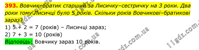 Вовчик–братик старший за Лисичку–сестричку на 3 роки. Два роки тому Лисичці було 5 років. Скільки років Вовчикові–братикові зараз? 1) 5 + 2 = 7 (років) – Лисичці зараз; 2) 7 + 3 = 10 (років) Відповідь: Вовчику зараз 10 років.