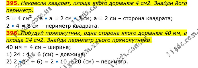 395. Накресли квадрат, площа якого дорівнює 4 см2. Знайди його периметр. S = 4 см2 = а • а = 2 см • 2 см; а = 2 см – сторона квадрата; 2 • 4 = 8 см – периметр квадрата. 396. Побудуй прямокутник, одна сторона якого дорівнює 40 мм, а площа 24 см2. Знайди периметр цього прямокутника. 40 мм = 4 см – ширина; 1) 24 : 4 = 6 (см) – довжина; 2) 2 • (4 + 6) = 2 • 10 = 20 (см) – периметр.