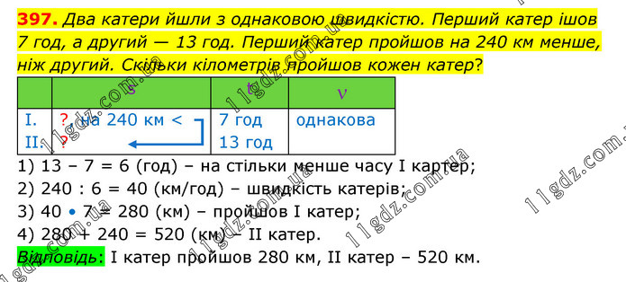 Два катери йшли з однаковою швидкістю. Перший катер ішов 7 год, а другий — 13 год. Перший катер пройшов на 240 км менше, ніж другий. Скільки кілометрів пройшов кожен катер? 1) 13 – 7 = 6 (год) – на стільки менше часу І картер; 2) 240 : 6 = 40 (км/год) – швидкість катерів; 3) 40 • 7 = 280 (км) – пройшов І катер; 4) 280 + 240 = 520 (км) – ІІ катер. Відповідь: І катер пройшов 280 км, ІІ катер – 520 км.