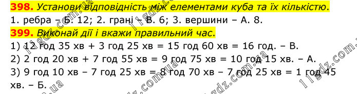 398. Установи відповідність між елементами куба та їх кількістю. 1. ребра – Б. 12; 2. грані – В. 6; 3. вершини – А. 8. 399. Виконай дії і вкажи правильний час. 1) 12 год 35 хв + 3 год 25 хв = 15 год 60 хв = 16 год. – В. 2) 2 год 20 хв + 7 год 55 хв = 9 год 75 хв = 10 год 15 хв. – А. 3) 9 год 10 хв – 7 год 25 хв = 8 год 70 хв – 7 год 25 хв = 1 год 45 хв. – Б.