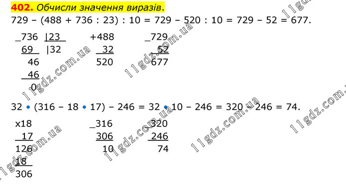 Обчисли значення виразів. 729 – (488 + 736 : 23) : 10 = 729 – 520 : 10 = 729 – 52 = 677. 32 • (316 – 18 • 17) – 246 = 32 • 10 – 246 = 320 – 246 = 74.