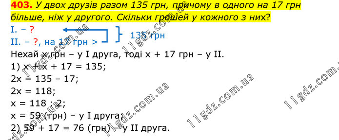 У двох друзів разом 135 грн, причому в одного на 17 грн більше, ніж у другого. Скільки грошей у кожного з них? Нехай х грн – у І друга, тоді х + 17 грн – у ІІ. 1) х + х + 17 = 135; 2х = 135 – 17; 2х = 118; х = 118 : 2; х = 59 (грн) – у І друга; 2) 59 + 17 = 76 (грн) – у ІІ друга.