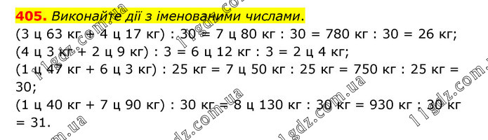 Виконайте дії з іменованими числами. (3 ц 63 кг + 4 ц 17 кг) : 30 = 7 ц 80 кг : 30 = 780 кг : 30 = 26 кг; (4 ц 3 кг + 2 ц 9 кг) : 3 = 6 ц 12 кг : 3 = 2 ц 4 кг; (1 ц 47 кг + 6 ц 3 кг) : 25 кг = 7 ц 50 кг : 25 кг = 750 кг : 25 кг = 30; (1 ц 40 кг + 7 ц 90 кг) : 30 кг = 8 ц 130 кг : 30 кг = 930 кг : 30 кг = 31.
