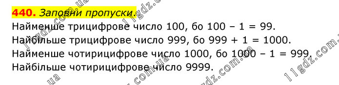 Заповни пропуски. Найменше трицифрове число 100, бо 100 – 1 = 99. Найбільше трицифрове число 999, бо 999 + 1 = 1000. Найменше чотирицифрове число 1000, бо 1000 – 1 = 999. Найбільше чотирицифрове число 9999.