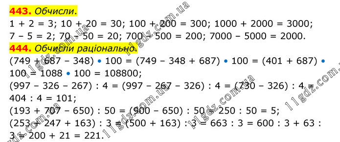 443. Обчисли. 1 + 2 = 3; 10 + 20 = 30; 100 + 200 = 300; 1000 + 2000 = 3000; 7 – 5 = 2; 70 – 50 = 20; 700 – 500 = 200; 7000 – 5000 = 2000. 444. Обчисли раціонально. (749 + 687 – 348) • 100 = (749 – 348 + 687) • 100 = (401 + 687) • 100 = 1088 • 100 = 108800; (997 – 326 – 267) : 4 = (997 – 267 – 326) : 4 = (730 – 326) : 4 = 404 : 4 = 101; (193 + 707 – 650) : 50 = (900 – 650) : 50 = 250 : 50 = 5; (253 + 247 + 163) : 3 = (500 + 163) : 3 = 663 : 3 = 600 : 3 + 63 : 3 = 200 + 21 = 221.
