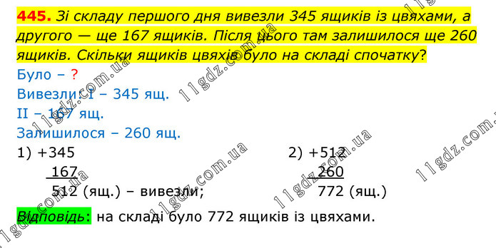 Зі складу першого дня вивезли 345 ящиків із цвяхами, а другого — ще 167 ящиків. Після цього там залишилося ще 260 ящиків. Скільки ящиків цвяхів було на складі спочатку? Було – ? Вивезли: І – 345 ящ. ІІ – 167 ящ. Залишилося – 260 ящ. Відповідь: на складі було 772 ящиків із цвяхами.
