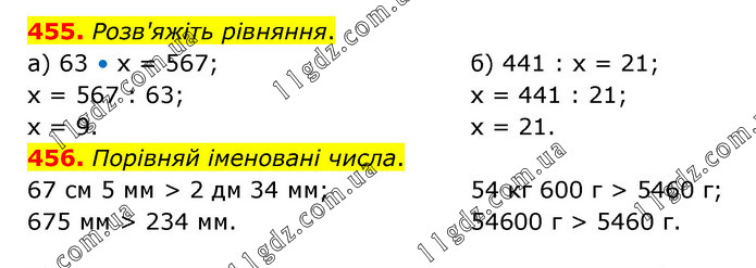 455. Розв'яжіть рівняння. а) 63 • х = 567; х = 567 : 63; х = 9. б) 441 : х = 21; х = 441 : 21; х = 21. 456. Порівняй іменовані числа. 67 см 5 мм > 2 дм 34 мм; 675 мм > 234 мм. 54 кг 600 г > 5460 г; 54600 г > 5460 г.