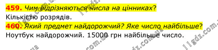 459. Чим відрізняються числа на цінниках? Кількістю розрядів. 460. Який предмет найдорожчий? Яке число найбільше? Ноутбук найдорожчий. 15000 грн найбільше число.