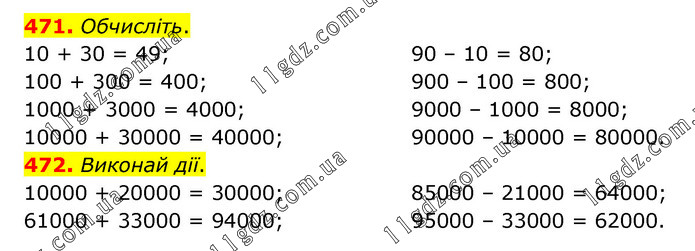471. Обчисліть. 10 + 30 = 49; 100 + 300 = 400; 1000 + 3000 = 4000; 10000 + 30000 = 40000; 90 – 10 = 80; 900 – 100 = 800; 9000 – 1000 = 8000; 90000 – 10000 = 80000. 472. Виконай дії. 10000 + 20000 = 30000; 61000 + 33000 = 94000; 85000 – 21000 = 64000; 95000 – 33000 = 62000.