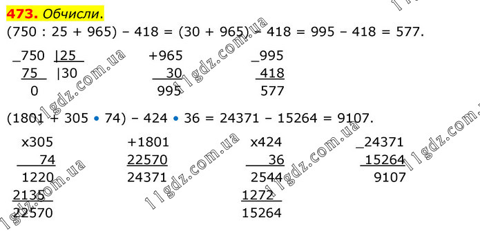 Обчисли. (750 : 25 + 965) – 418 = (30 + 965) – 418 = 995 – 418 = 577. (1801 + 305 • 74) – 424 • 36 = 24371 – 15264 = 9107.