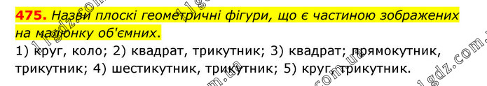Назви плоскі геометричні фігури, що є частиною зображених на малюнку об'ємних. 1) круг, коло; 2) квадрат, трикутник; 3) квадрат; прямокутник, трикутник; 4) шестикутник, трикутник; 5) круг, трикутник.