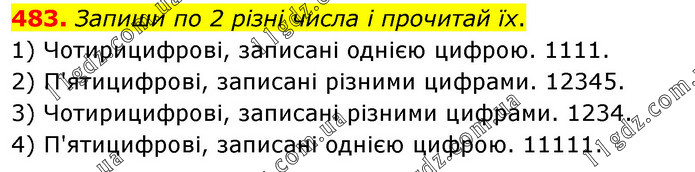 Запиши по 2 різні числа і прочитай їх. 1) Чотирицифрові, записані однією цифрою. 1111. 2) П'ятицифрові, записані різними цифрами. 12345. 3) Чотирицифрові, записані різними цифрами. 1234. 4) П'ятицифрові, записані однією цифрою. 11111.