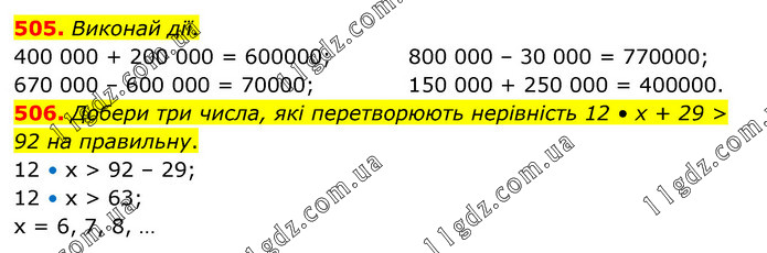 505. Виконай дії. 400 000 + 200 000 = 600000; 670 000 – 600 000 = 70000; 800 000 – 30 000 = 770000; 150 000 + 250 000 = 400000. 506. Добери три числа, які перетворюють нерівність 12 • х + 29 > 92 на правильну. 12 • х > 92 – 29; 12 • х > 63; x = 6, 7, 8, …