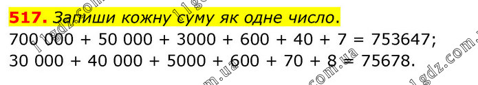 Запиши кожну суму як одне число. 700 000 + 50 000 + 3000 + 600 + 40 + 7 = 753647; 30 000 + 40 000 + 5000 + 600 + 70 + 8 = 75678.