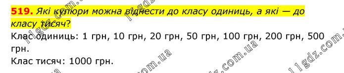 Які купюри можна віднести до класу одиниць, а які — до класу тисяч? Клас одиниць: 1 грн, 10 грн, 20 грн, 50 грн, 100 грн, 200 грн, 500 грн. Клас тисяч: 1000 грн.