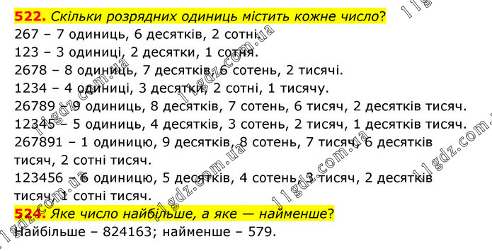 522. Скільки розрядних одиниць містить кожне число? 267 – 7 одиниць, 6 десятків, 2 сотні. 123 – 3 одиниці, 2 десятки, 1 сотня. 2678 – 8 одиниць, 7 десятків, 6 сотень, 2 тисячі. 1234 – 4 одиниці, 3 десятки, 2 сотні, 1 тисячу. 26789 – 9 одиниць, 8 десятків, 7 сотень, 6 тисяч, 2 десятків тисяч. 12345 – 5 одиниць, 4 десятків, 3 сотень, 2 тисяч, 1 десятків тисяч. 267891 – 1 одиницю, 9 десятків, 8 сотень, 7 тисяч, 6 десятків тисяч, 2 сотні тисяч. 123456 – 6 одиницю, 5 десятків, 4 сотень, 3 тисяч, 2 десятків тисяч, 1 сотні тисяч. 524. Яке число найбільше, а яке — найменше? Найбільше – 824163; найменше – 579.
