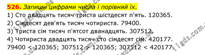 Запиши цифрами числа і порівняй їх. 1) Сто двадцять тисяч триста шістдесят п'ять. 120365. 2) Сімдесят дев'ять тисяч чотириста. 79400. 3) Триста сім тисяч п'ятсот дванадцять. 307512. 4) Чотириста двадцять тисяч сто сімдесят сім. 420177. 79400 < 120365; 307512 > 120365; 307512 < 420177.
