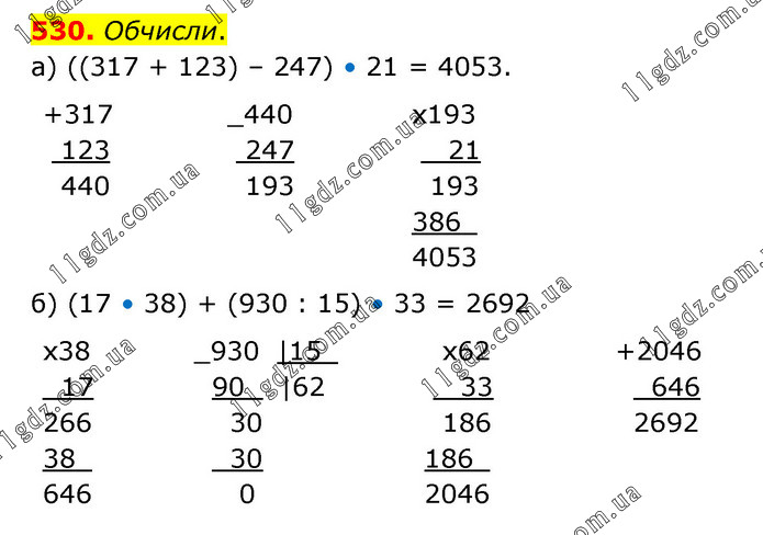 Обчисли. а) ((317 + 123) – 247) • 21 = 4053. б) (17 • 38) + (930 : 15) • 33 = 2692