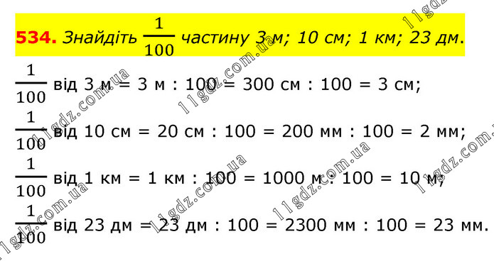 Знайдіть 1/100 частину 3 м; 10 см; 1 км; 23 дм. 1/100 від 3 м = 3 м : 100 = 300 см : 100 = 3 см; 1/100 від 10 см = 20 см : 100 = 200 мм : 100 = 2 мм; 1/100 від 1 км = 1 км : 100 = 1000 м : 100 = 10 м; 1/100 від 23 дм = 23 дм : 100 = 2300 мм : 100 = 23 мм.