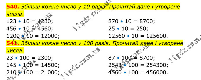 540. Збільш кожне число у 10 разів. Прочитай дане і утворене числа. 123 • 10 = 1230; 456 • 10 = 4560; 1200 • 10 = 12000; 870 • 10 = 8700; 25 • 10 = 250; 12560 • 10 = 125600. 541. Збільш кожне число у 100 разів. Прочитай дане і утворене числа. 23 • 100 = 2300; 145 • 100 = 14500; 210 • 100 = 21000; 87 • 100 = 8700; 2543 • 100 = 254300; 4560 • 100 = 456000.