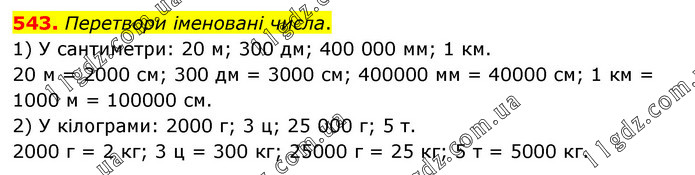 Перетвори іменовані числа. 1) У сантиметри: 20 м; 300 дм; 400 000 мм; 1 км. 20 м = 2000 см; 300 дм = 3000 см; 400000 мм = 40000 см; 1 км = 1000 м = 100000 см. 2) У кілограми: 2000 г; 3 ц; 25 000 г; 5 т. 2000 г = 2 кг; 3 ц = 300 кг; 25000 г = 25 кг; 5 т = 5000 кг.